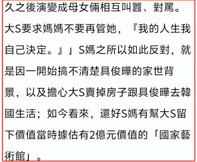 无奈之下,大S只能“妥协”,把位于国家艺术馆的豪宅过户给S妈,才换来了母亲的默认。